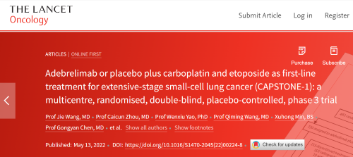 北京时间2022年5月14日,九游会(J9)医药自主研发的PD-L1抑制剂阿得贝利单抗治疗广泛期小细胞肺癌的III期临床研究(CAPSTONE-1研究)成果正式全文在线发表于国际权威学术期刊《柳叶刀·肿瘤学》(《THE LANCET Oncology》,影响因子41.316)。CAPSTONE-1研究结果显示,阿得贝利单抗联合化疗一线治疗广泛期小细胞肺癌相较于安慰剂联合化疗可以显著延长患者总生存期至15.3个月[1],刷新现有免疫药物一线治疗广泛期小细胞肺癌的总生存纪录[2]。