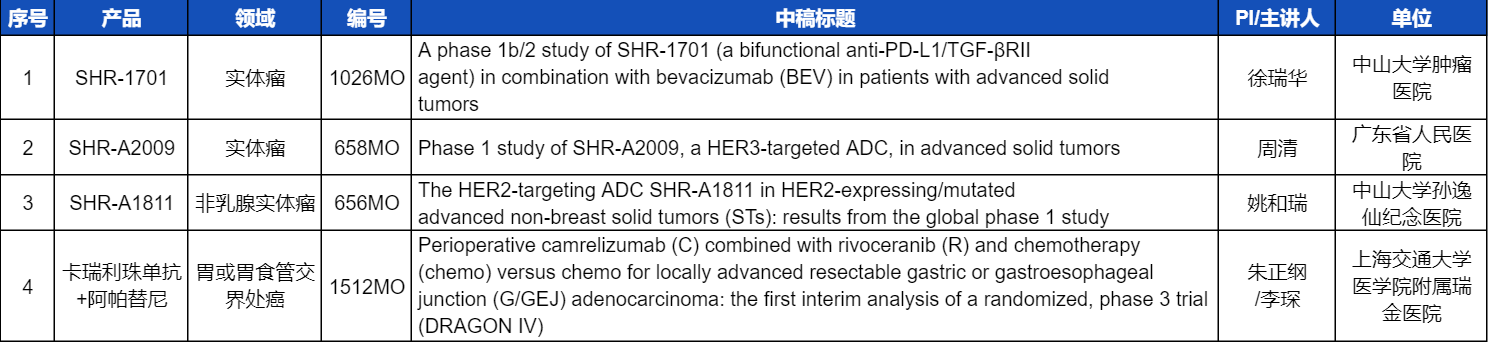 本次ESMO大会,将由中山大学肿瘤医院徐瑞华教授、广东省人民医院周清教授、中山大学孙逸仙纪念医院姚和瑞教授、上海交通大学医学院附属瑞金医院李琛教授分别就4项九游会(J9)医药创新产品相关研究做口头报告,包括SHR-1701、SHR-A2009、SHR-A1811这3款未上市创新产品的实体瘤治疗临床研究,以及1项“双艾”组合(卡瑞利珠单抗联合阿帕替尼)治疗局部晚期可切除胃/胃食管交界处癌的Ⅲ期临床试验期中分析。