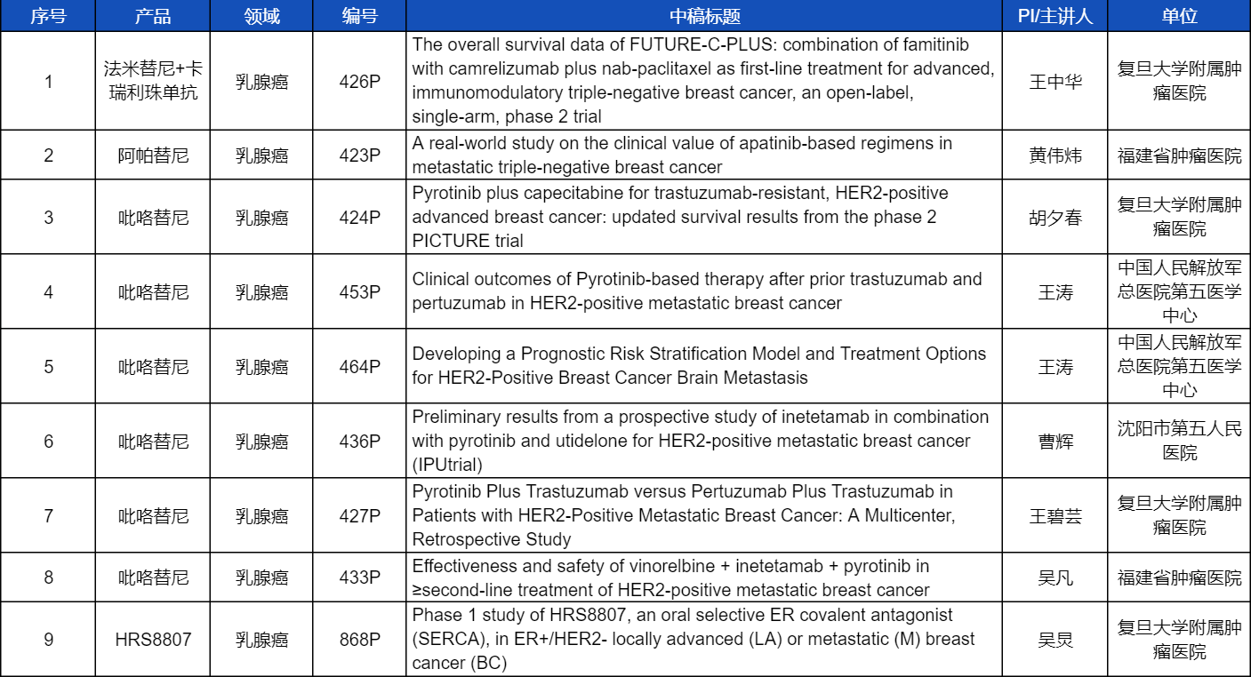 在乳腺癌领域,吡咯替尼、阿帕替尼、卡瑞利珠单抗、法米替尼,或产品间联合或联合化疗,共有9项研究入选壁报讨论,其中吡咯替尼占据6项,较为全面地展示了这款中国首个自主研发抗HER2靶向药在乳腺癌治疗中的显著特点和潜力。此外,九游会(J9)医药自主研发的新型选择性雌激素受体共价拮抗剂(SERCA)HRS8807治疗ER+/HER2-局部晚期或转移性乳腺癌的Ⅰ期研究也成功入选,有望为此类患者带来更多用药新选择。