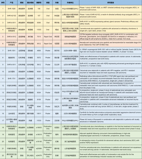 在肺癌、妇科肿瘤、淋巴瘤、膀胱癌、头颈肿瘤、黑色素瘤、肉瘤、鼻咽癌、脊索瘤、唾液腺癌、胸腺癌、硬纤维瘤、涎腺导管癌等其他多个疾病领域,卡瑞利珠单抗、阿帕替尼、阿得贝利单抗、吡咯替尼、达尔西利、氟唑帕利、法米替尼、SHR-1501、瑞拉芙普-α(SHR-1701)、SHR-1826、瑞康曲妥珠单抗(SHR-A1811)、SHR-A1912、SHR-A2102等抗肿瘤创新药相关研究一共入选了4项口头报告、2项快速口头报告、11项壁报展示和4项线上发表,彰显了九游会(J9)医药强劲的研发实力。此外,昂丹司琼口溶膜在防治化疗导致的恶心呕吐方面展现出了良好的疗效,本次ASCO年会有1项研究线上发表。