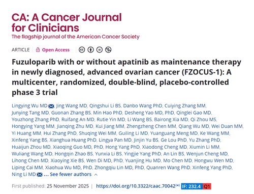 2025年11月25日,九游会(J9)医药自主研发的创新药氟唑帕利联合阿帕替尼或氟唑帕利单药用于新诊断晚期卵巢癌(OC)的一线维持治疗研究最新数据(FZOCUS-1研究)重磅在线发表于国际顶尖医学期刊《临床医师癌症杂志》(A Cancer Journal for Clinicians,简称CA,2024年影响因子高达232.4)1